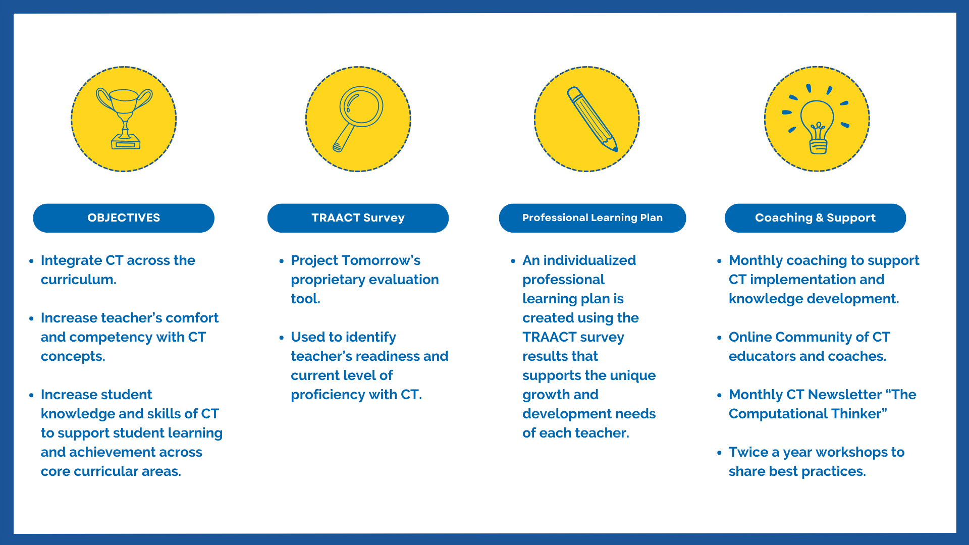 Central to our model is meeting teachers where they are regarding CT. Using a proprietary evaluation tool developed for this project, we identify each individual teacher’s readiness and current level of proficiency with CT to determine an individualized professional learning plan that directly supports the unique growth and development needs of each teacher.